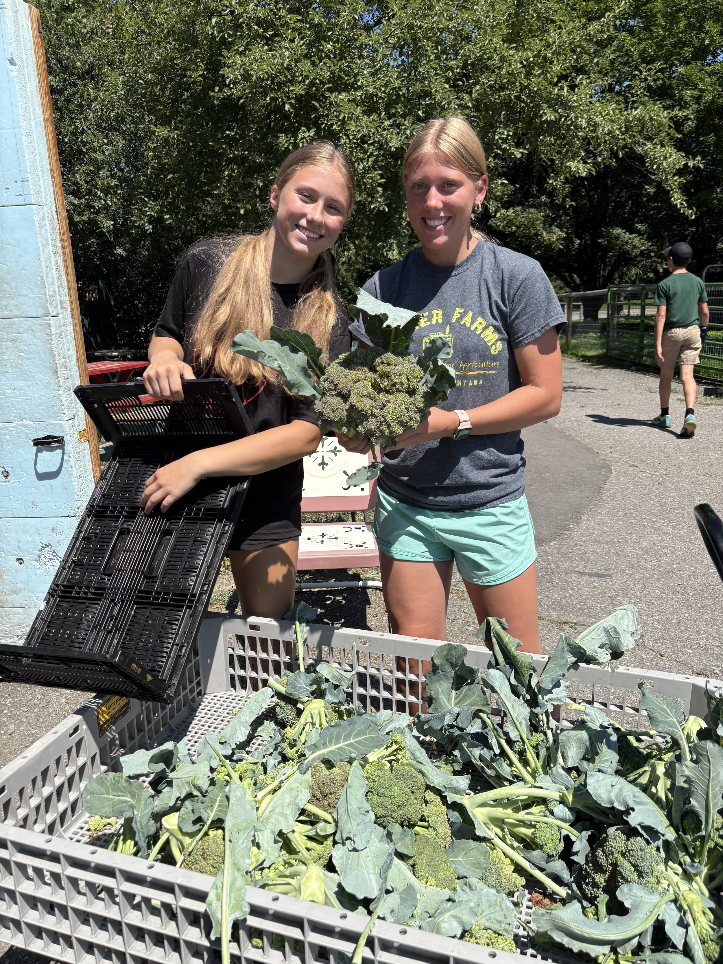 ~Broccoli- Check out the picture below of some of our interns with their 2nd wagon full of broccoli! We have so much broccoli! If you want to freeze some for the winter, stop by the Farm Store! The fridges are loaded with broccoli!